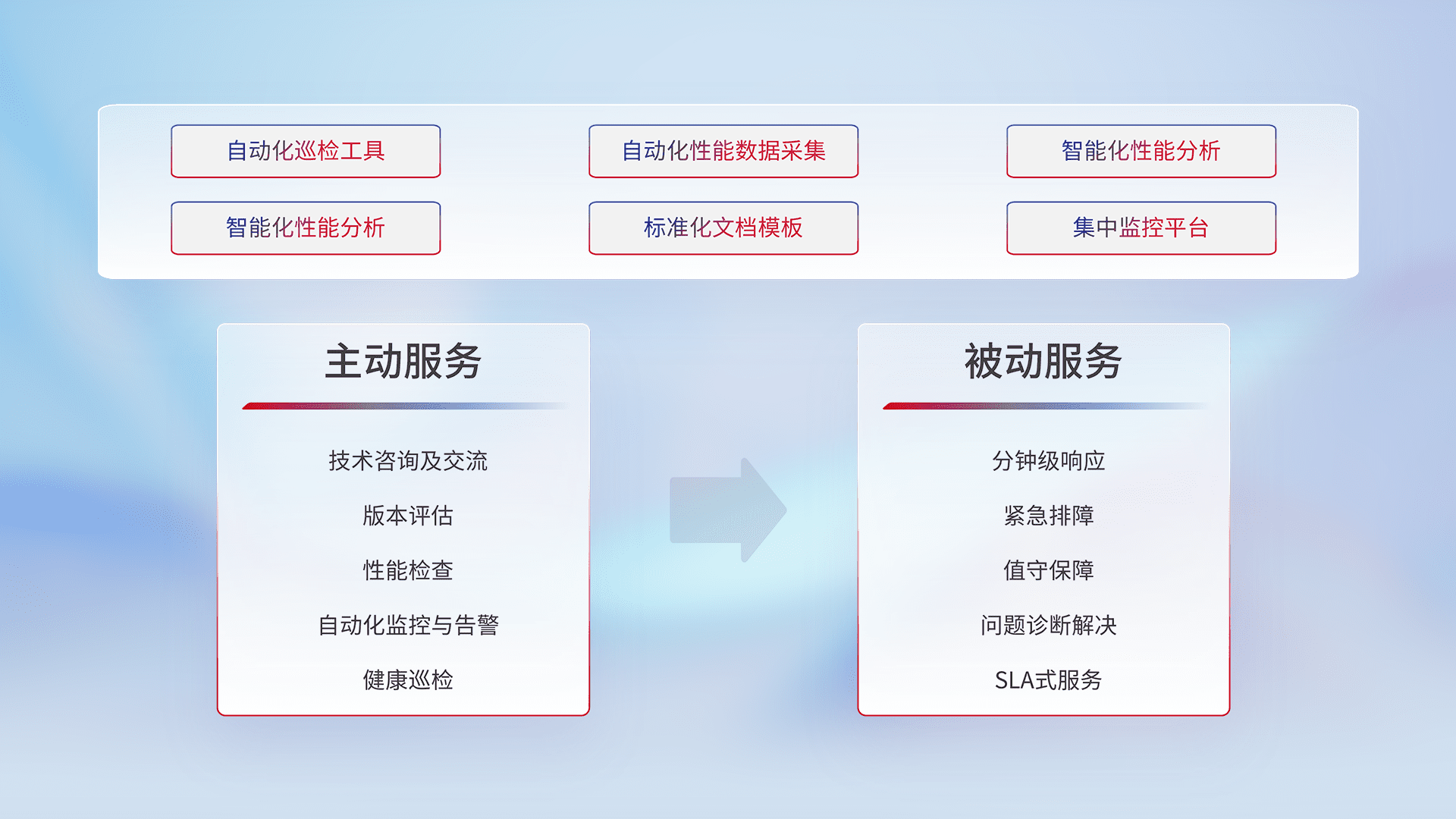 智能化工具和标准化文档,,,,保障服务质量,,提供主动服务(包含技术咨询、、版本评估、、、、性能检查、、自动化监控与告警、、、、健康巡检)和被动服务包含(分钟级响应、、、紧急排障、、值守保障、、、、问题诊断解决、、、SLA服务)。。。。
