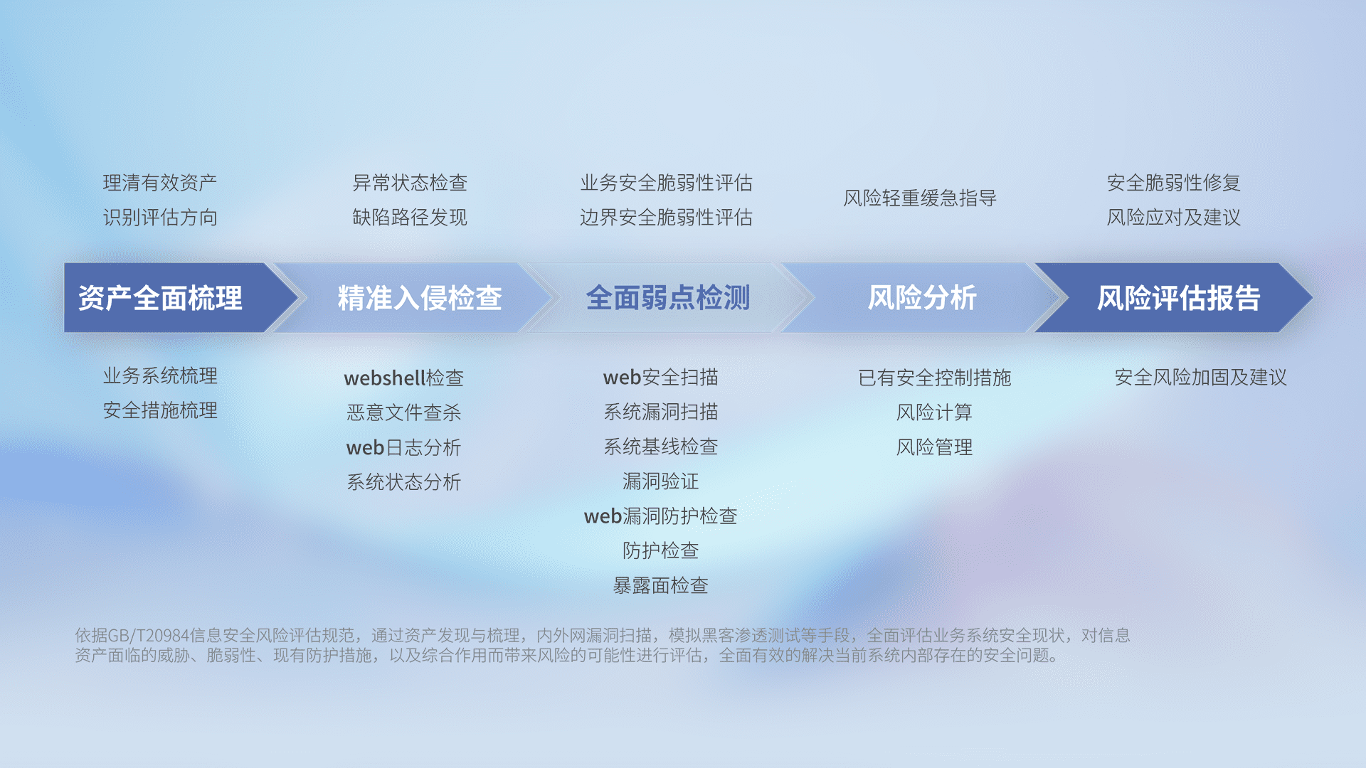 针对客户行业特性,,以专业的安全服务+多厂商联合解决方案提供专属的一站式安全管理服务,,,,帮助客户全面感知网络空间威胁,,,基于识别、、、检测、、、分析、、防护、、、监测、、、响应的服务理论模型,,,从方案咨询、、、、集成交付、、评估验证、、、、优化加固、、、运维运营,,,,致力于为客户提供完整的闭环管理式安全服务。。以实战经验为客户打造高抵御风险的安全体系,,,帮助客户发现威胁、、对抗威胁、、、处置威胁,,,不断积累安全对抗能力,,,持续保障数字化安全。。。